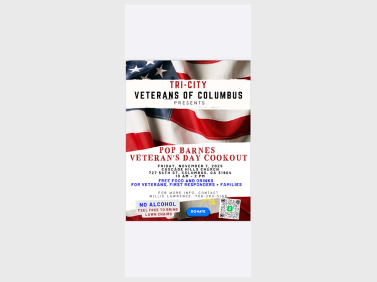 The Tri -city Veterans in Cascade Hills Park presents,  Pop Barnes Veterans Day Cookout on Friday, November 7, 2025 at 10:00 a.m.  There will be free food for veterans and first responders. https://www.facebook.com/share/p/1Bp1Be7DaY/