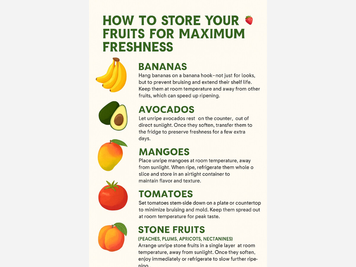 Hang bananas on a banana hook—not just for looks, but to prevent bruising and extend their shelf life. Keep them at room temperature and away from other fruits, which can speed up ripening.