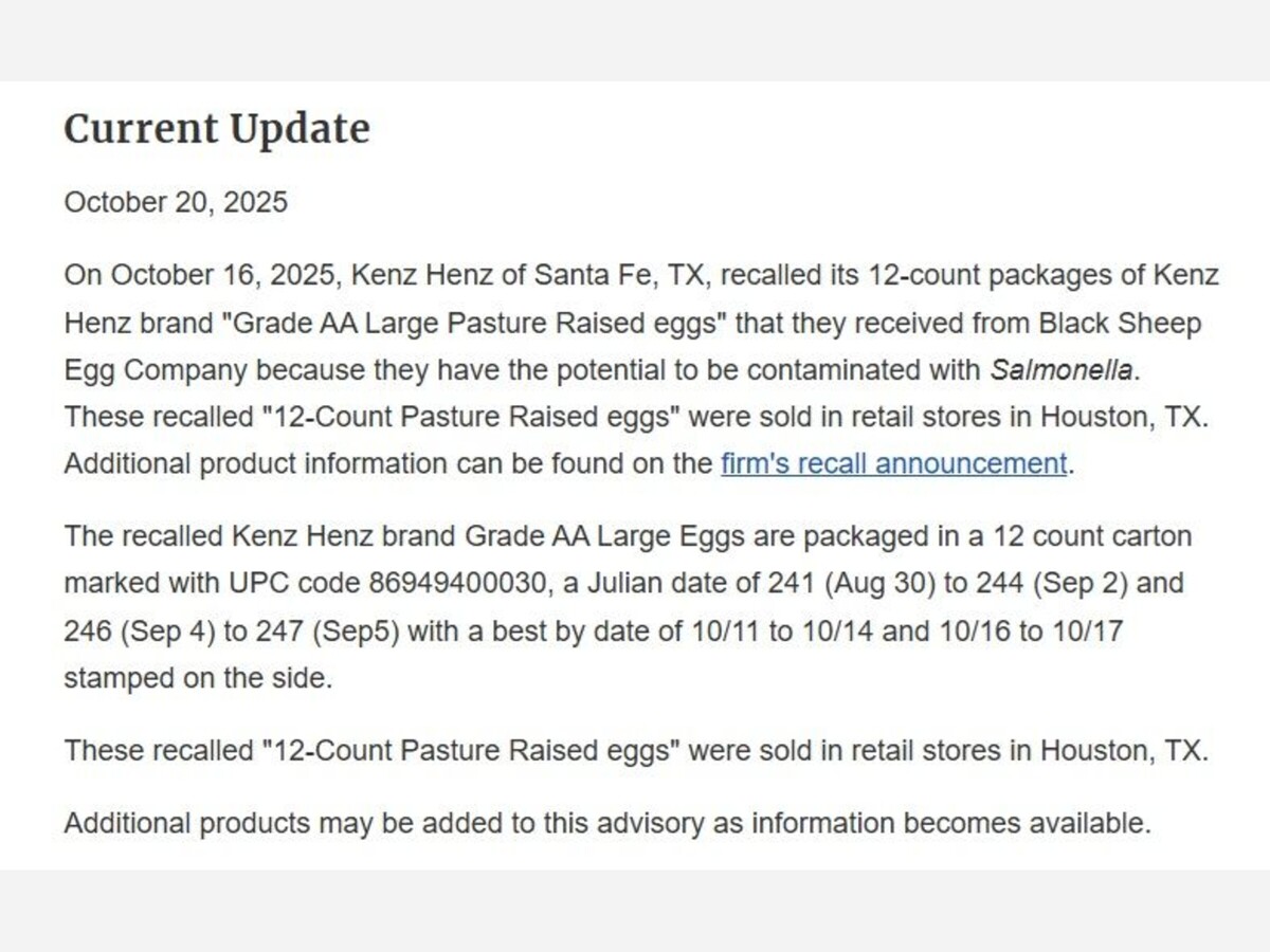 However, in October 2025, Black Sheep Egg Company initiated a recall for its large Grade A brown eggs due to potential Salmonella contamination, and Kenz Henz recalled its "Pasture Raised eggs" which were supplied by Black Sheep Egg Company. These recalls are classified as having a highest risk level by the FDA. Recalled products